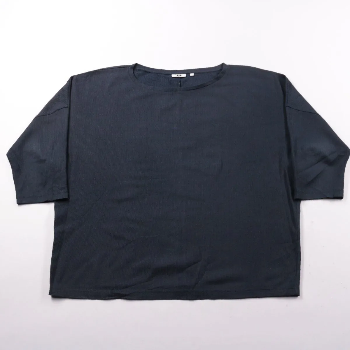 Женский лонгслив WE тёмно-синего цвета из фактурного трикотажа. Свободный крой и рукав 3/4 подойдут для повседневных образов и офиса в стиле casual. Материал почти не мнётся и легко сочетается с джинсами или юбкой.