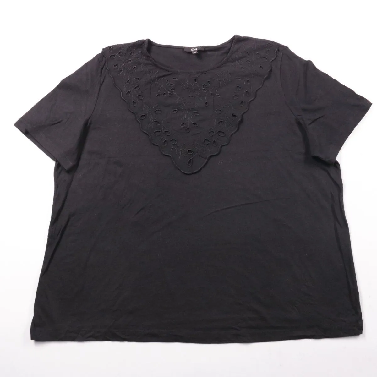 Женская футболка C&A чёрного цвета с коротким рукавом и декоративной вышивкой ришелье спереди. Подойдёт для повседневных образов и офиса в сочетании с джинсами или юбкой. Мягкий трикотаж удобен в носке и легко комбинируется с базовым гардеробом.