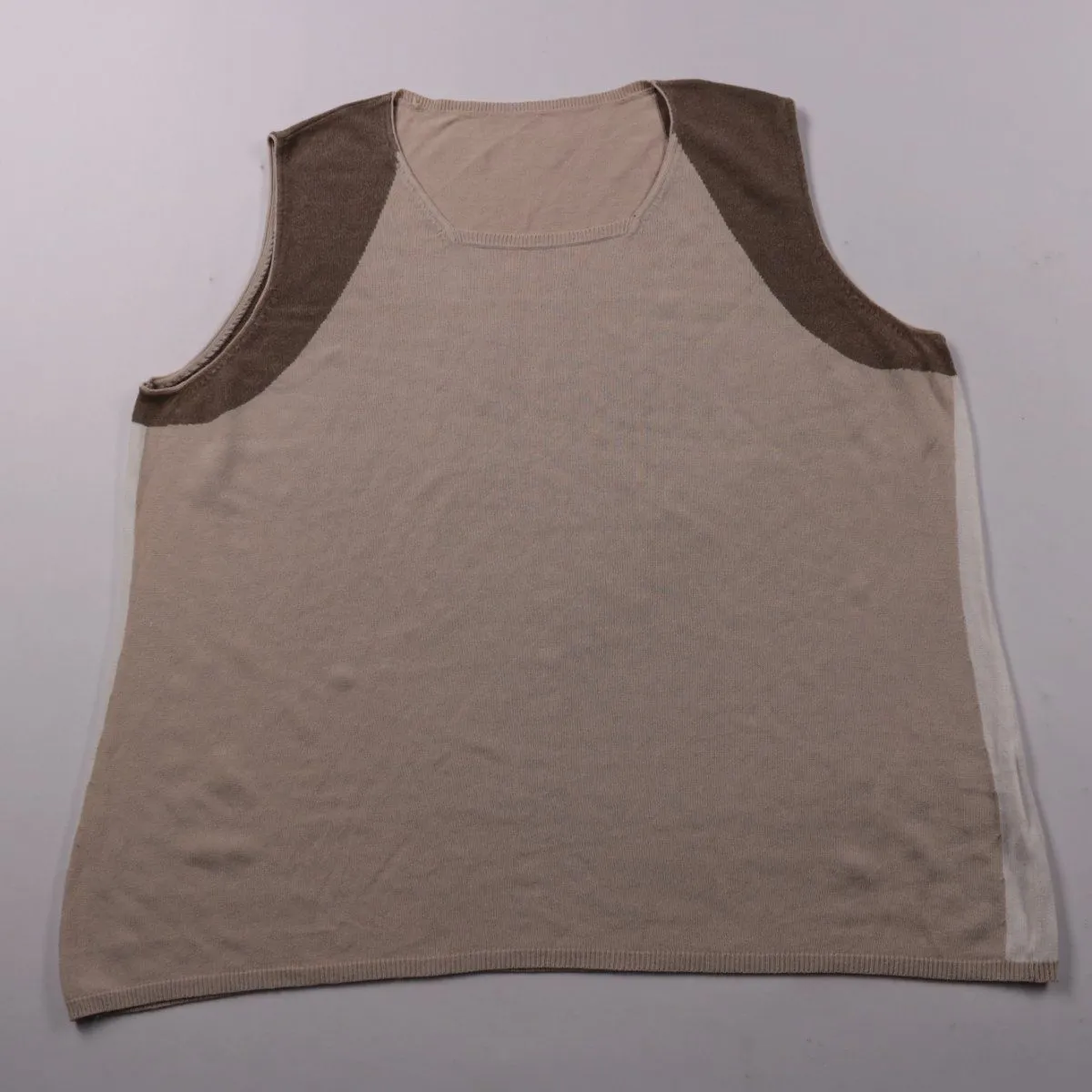 Женский трикотажный топ Mayerline без рукавов в спокойной бежево-коричневой гамме. Подойдёт для повседневных образов и офиса под жакет или кардиган. Смесовый состав с хлопком приятен к телу и хорошо дышит.