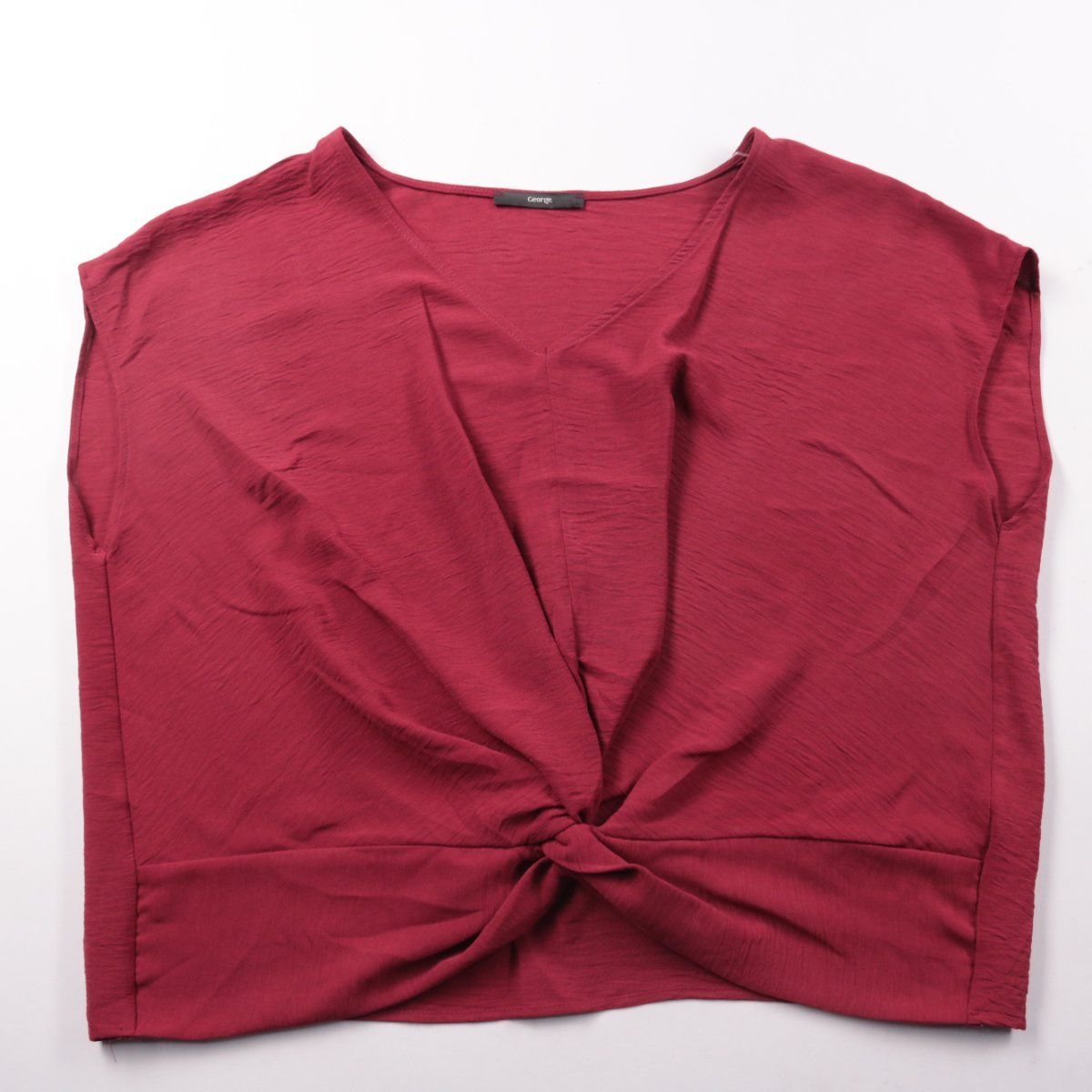 Женский топ George бордового цвета с V-образным вырезом и декоративным узлом/перекрутом спереди. Подойдёт для повседневных образов и офиса с брюками или юбкой. Лёгкий полиэстер меньше мнётся и быстро сохнет.