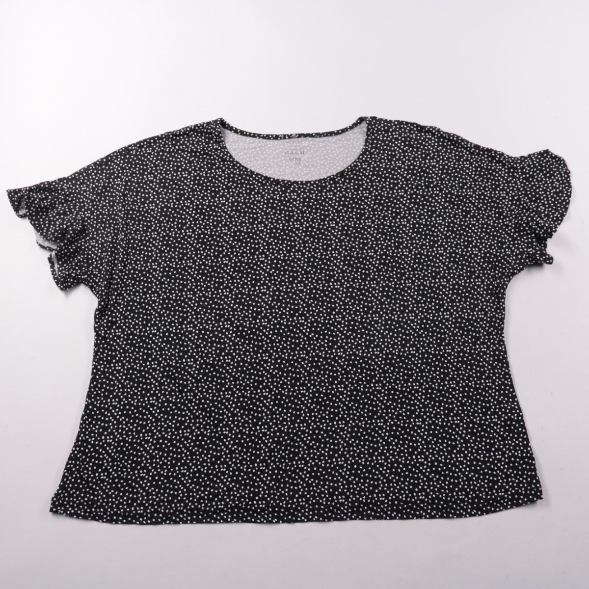 Женская футболка George чёрного цвета в мелкий белый горошек, с круглым вырезом и короткими рукавами с лёгкой оборкой. Подойдёт для повседневных летних образов и комфортно носится за счёт мягкой вискозной ткани с добавлением эластана.