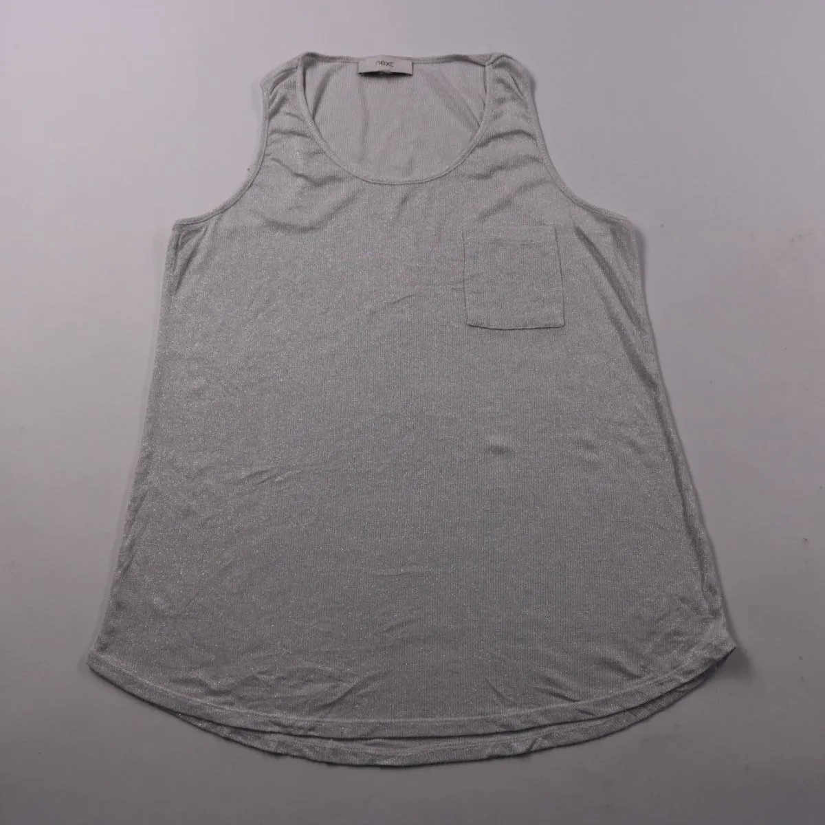 Женская майка Next серебристого оттенка с лёгким блеском и накладным карманом на груди. Подойдёт для лета и тёплой погоды, удобно носить как самостоятельный верх или под жакет/кардиган. Практичный плюс — мягкий трикотаж и удлинённая спинка с округлым низом.
