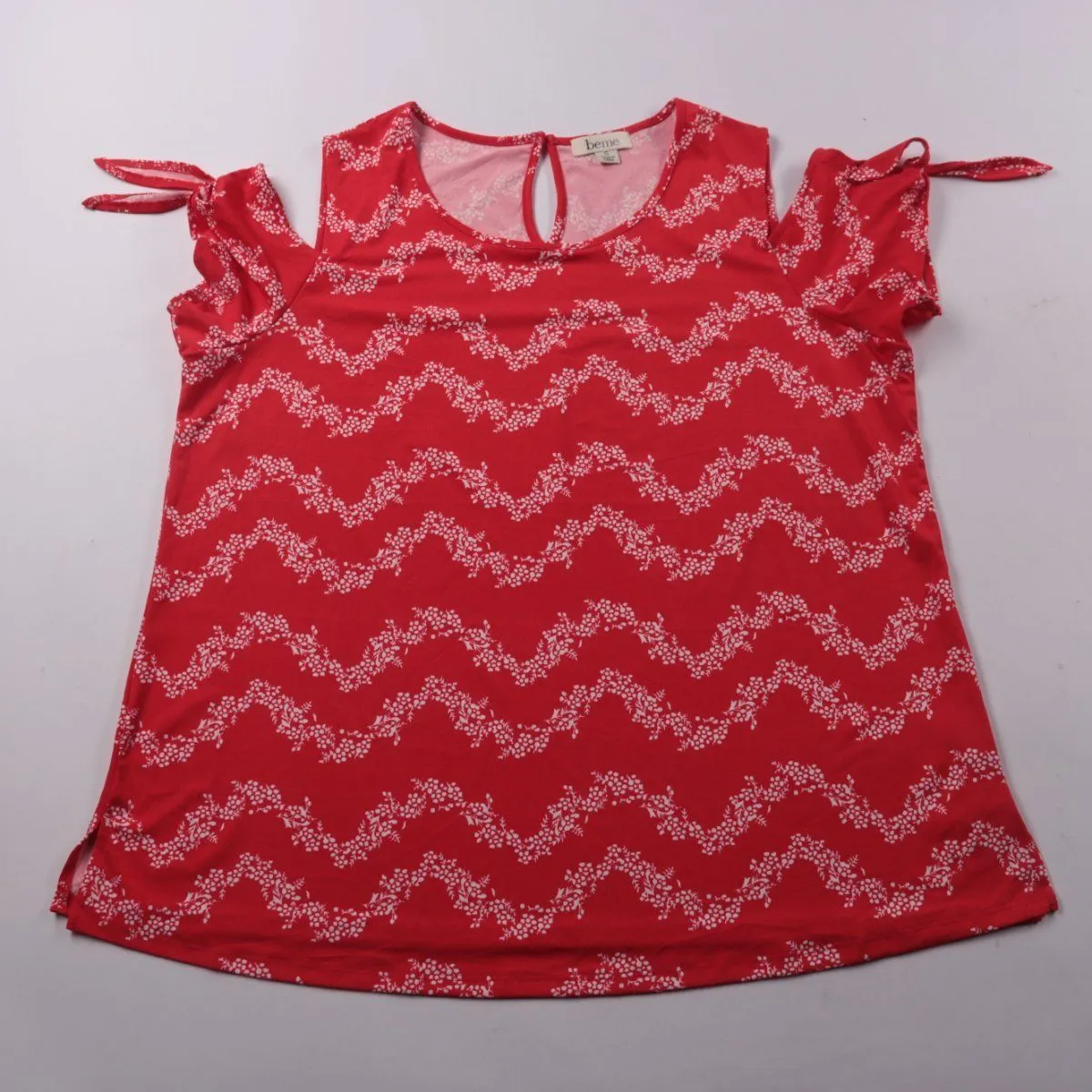 Топ Beme красного цвета с белым зигзагообразным принтом и открытыми плечами, рукава завязываются на бант. Подойдёт для лета и тёплой погоды, хорошо смотрится с джинсами и шортами. Тянущаяся ткань комфортно садится по фигуре.