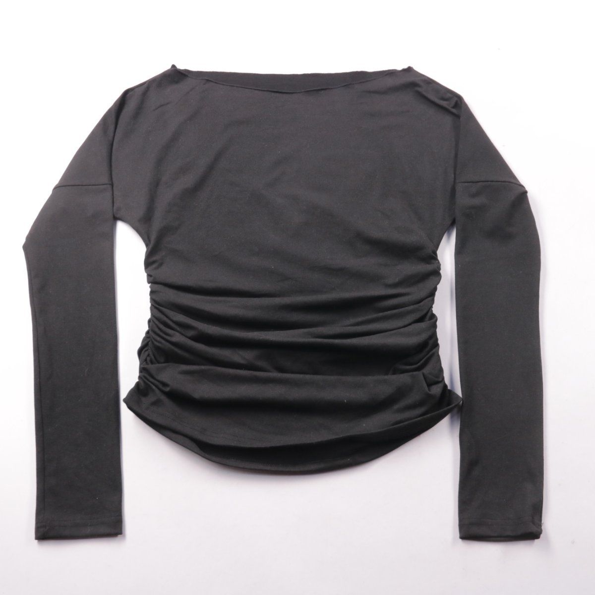 Женский чёрный лонгслив из эластичной ткани, с боковой сборкой и вырезом лодочкой. Подойдёт для повседневных образов и как базовый верх в прохладную погоду. Материал хорошо тянется и комфортно садится по фигуре.
