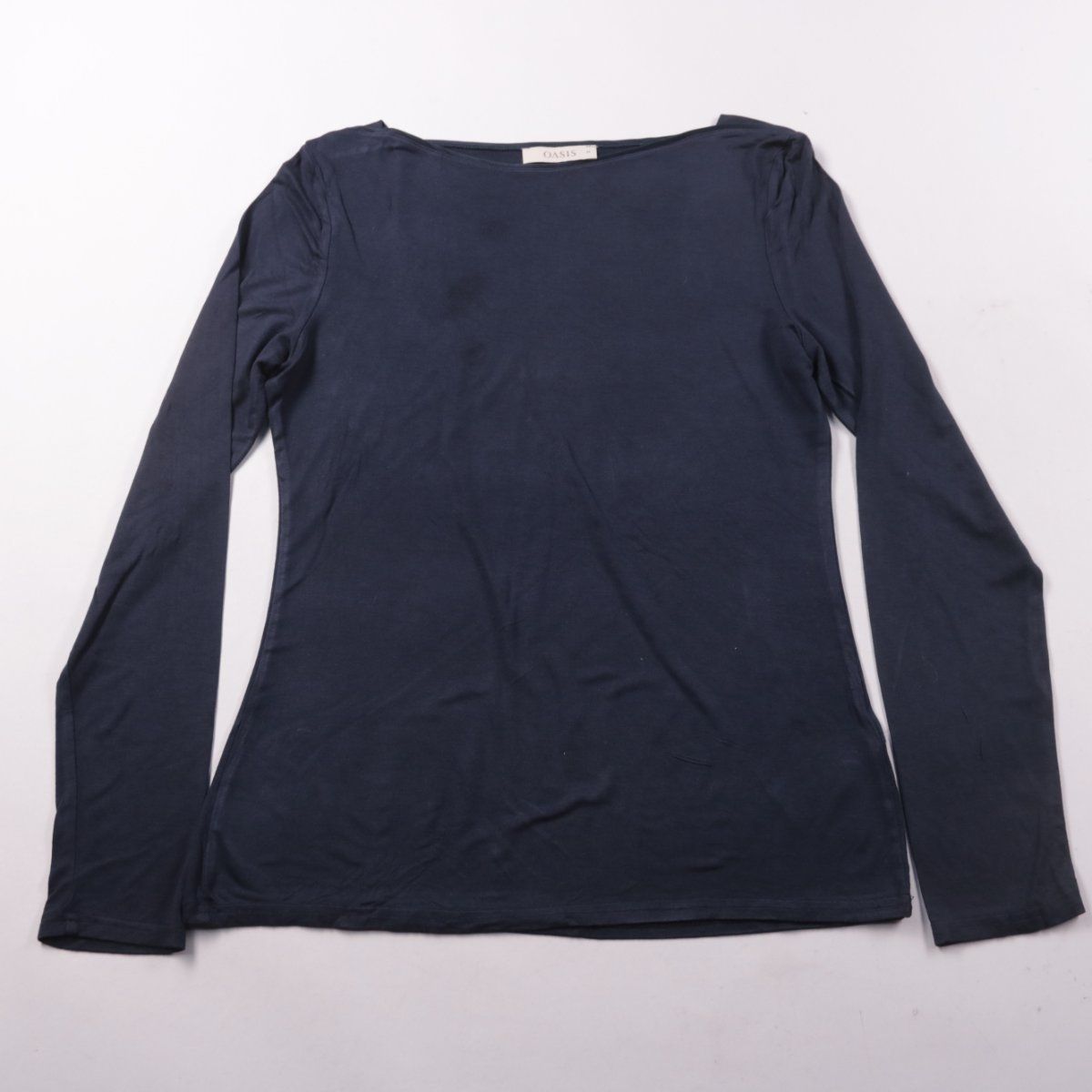 Лонгслив Oasis тёмно-синего цвета с вырезом «лодочка» и длинным рукавом. Подойдёт для повседневных образов и как базовый слой под жакет или кардиган. Ткань с вискозой и эластаном мягкая и немного тянется, поэтому комфортно садится по фигуре.