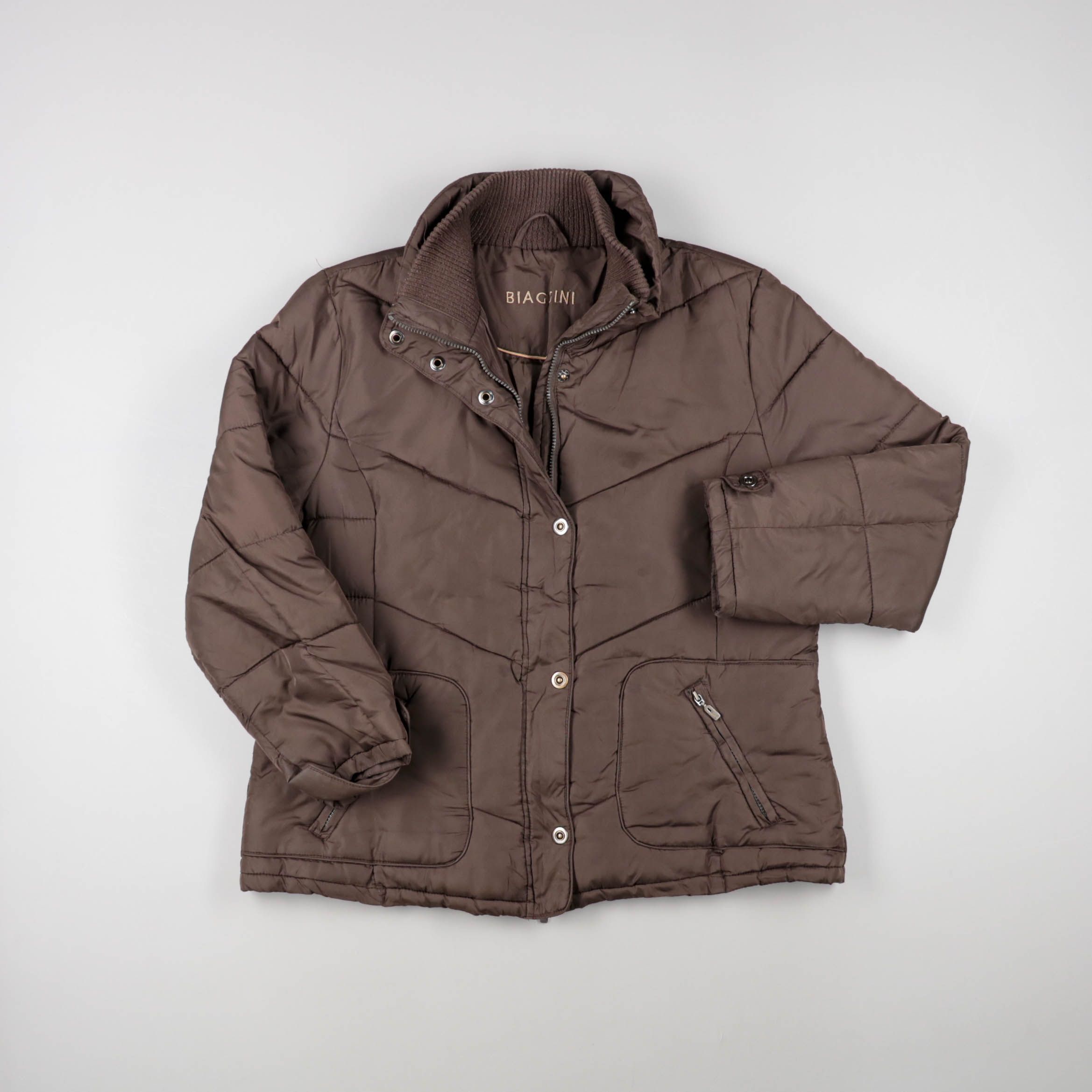 Стёганая демисезонная куртка Biagini коричневого цвета с высоким воротником и застёжкой на молнию и кнопки. Подойдёт для повседневных прогулок в прохладную погоду, есть удобные карманы на молниях. Практична в носке и легко сочетается с базовым гардеробом.