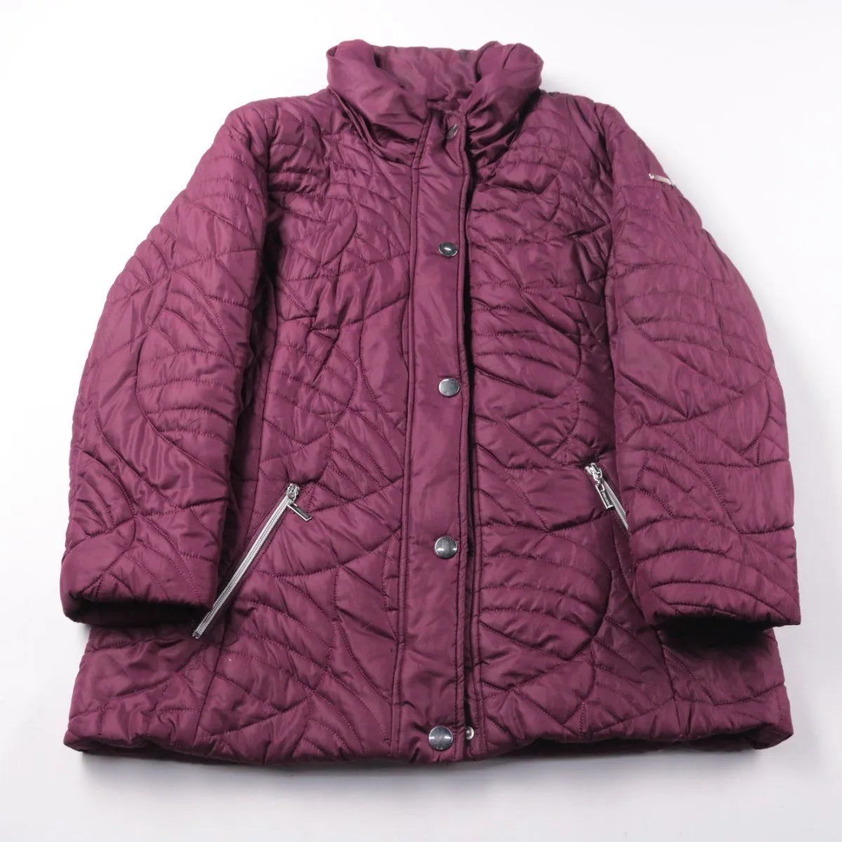 Стёганая демисезонная куртка Laura бордового цвета с высоким воротником и застёжкой на кнопки. Подойдёт для прохладной весны и осени, удобно сочетается с повседневными образами. Практичные карманы на молниях помогают держать мелочи под рукой.