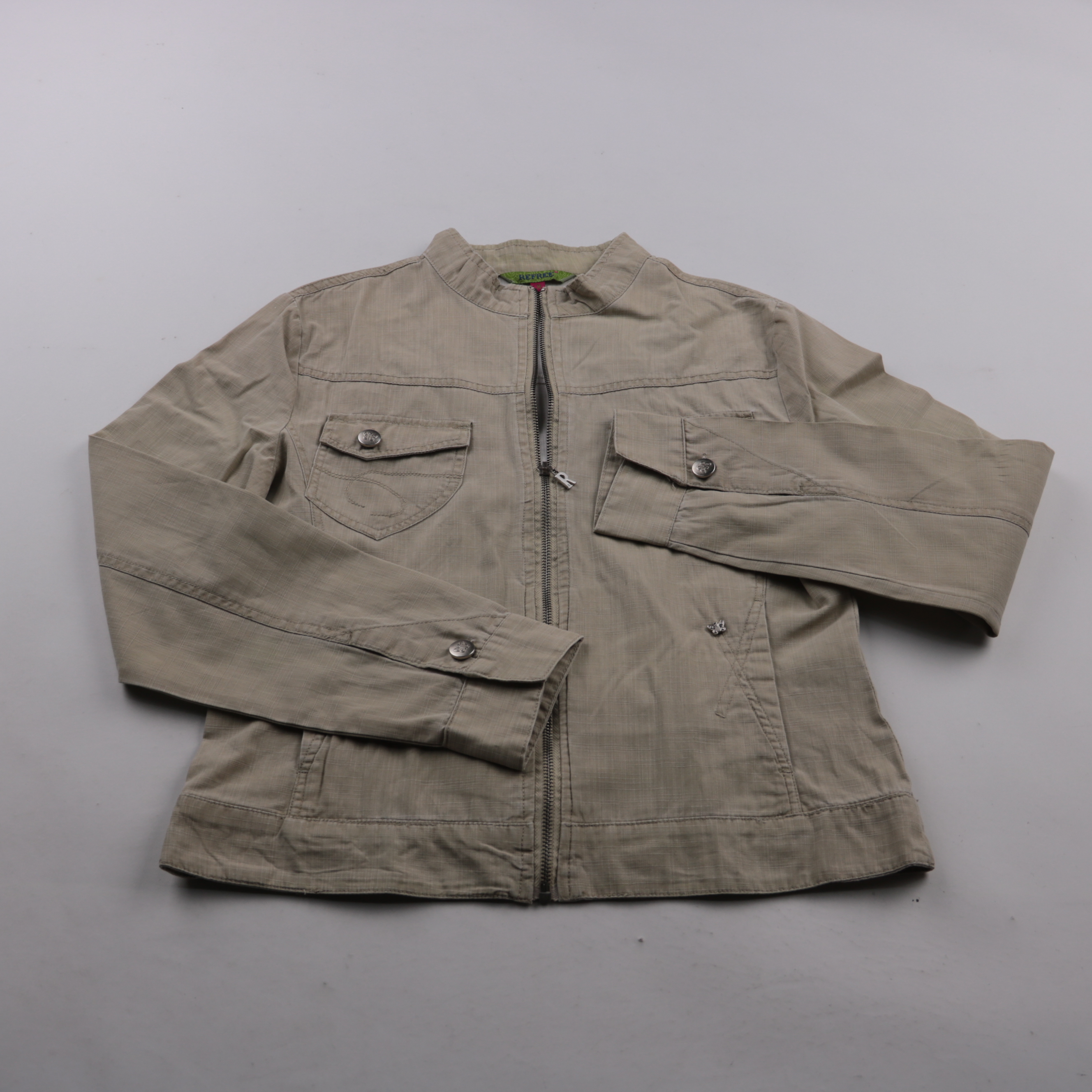 Лёгкая женская куртка Refree бежевого цвета на молнии, с воротником-стойкой и нагрудными карманами с клапанами. Подойдёт для прогулок и повседневных образов в тёплую весну/осень, удобно носить поверх футболки или тонкого свитера. Натуральный хлопок хор...