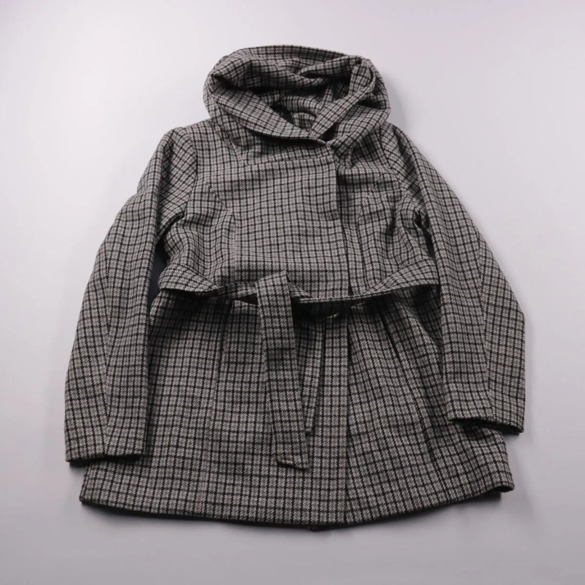 Женское пальто Amisu в сером цвете с клетчатым рисунком и капюшоном, застёгивается на запах и фиксируется поясом. Подойдёт для прохладной погоды осенью/весной и на каждый день, хорошо смотрится с джинсами и ботинками. Практичный плюс — мягкая ткань и пояс позволяют регулировать посадку по фигуре.