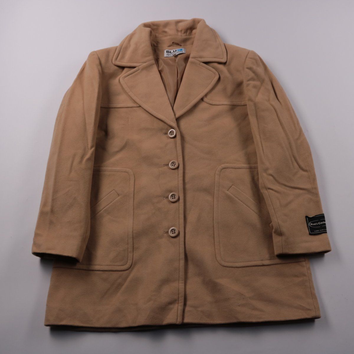 Женское пальто Blue Motion бежевого цвета с классическим отложным воротником и застёжкой на пуговицы. Подойдёт для повседневных образов в прохладную погоду весной и осенью, удобно сочетать с джинсами и платьями. Тёплая смесовая ткань с шерстью и кашемиром лучше держит тепло и форму.