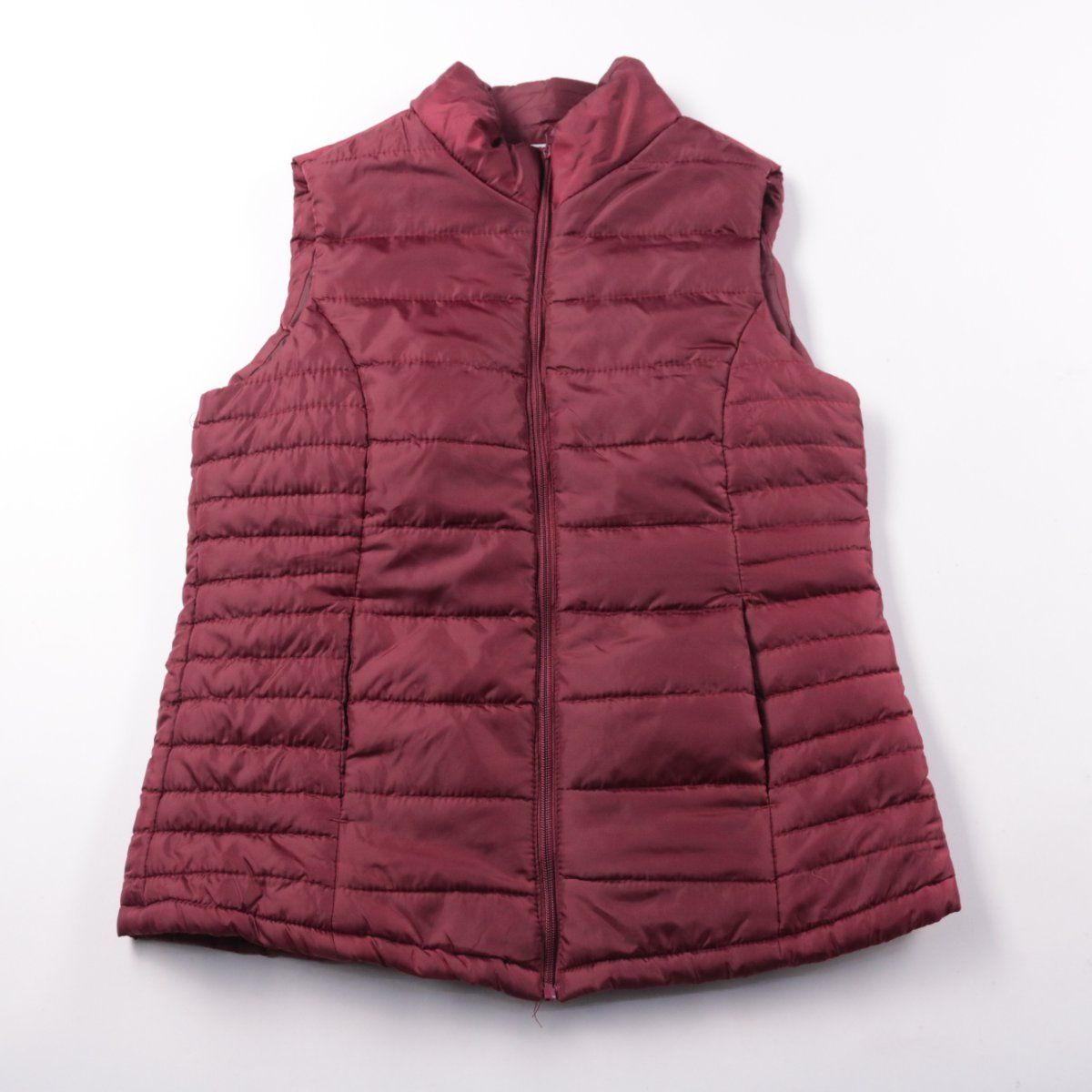 Стёганый женский жилет Janina бордового цвета на молнии и с воротником-стойкой. Подойдёт для прохладной весны/осени и для многослойных образов поверх свитера или худи. Лёгкий и компактный, удобно брать с собой и быстро надевать поверх базовой одежды.