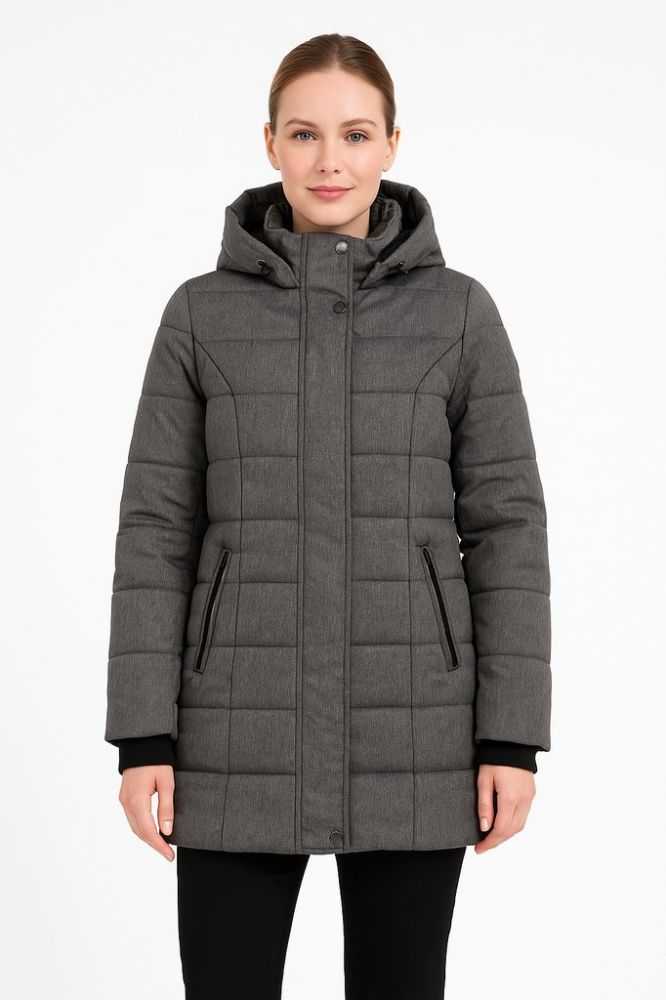 Зимняя стёганая куртка Miss Liberto серого цвета с капюшоном и застёжкой на молнию/кнопки. Подойдёт для повседневной носки в холодную погоду, хорошо сочетается с джинсами и обувью на низком ходу. Практичная — есть карманы и плотные манжеты, которые защ...