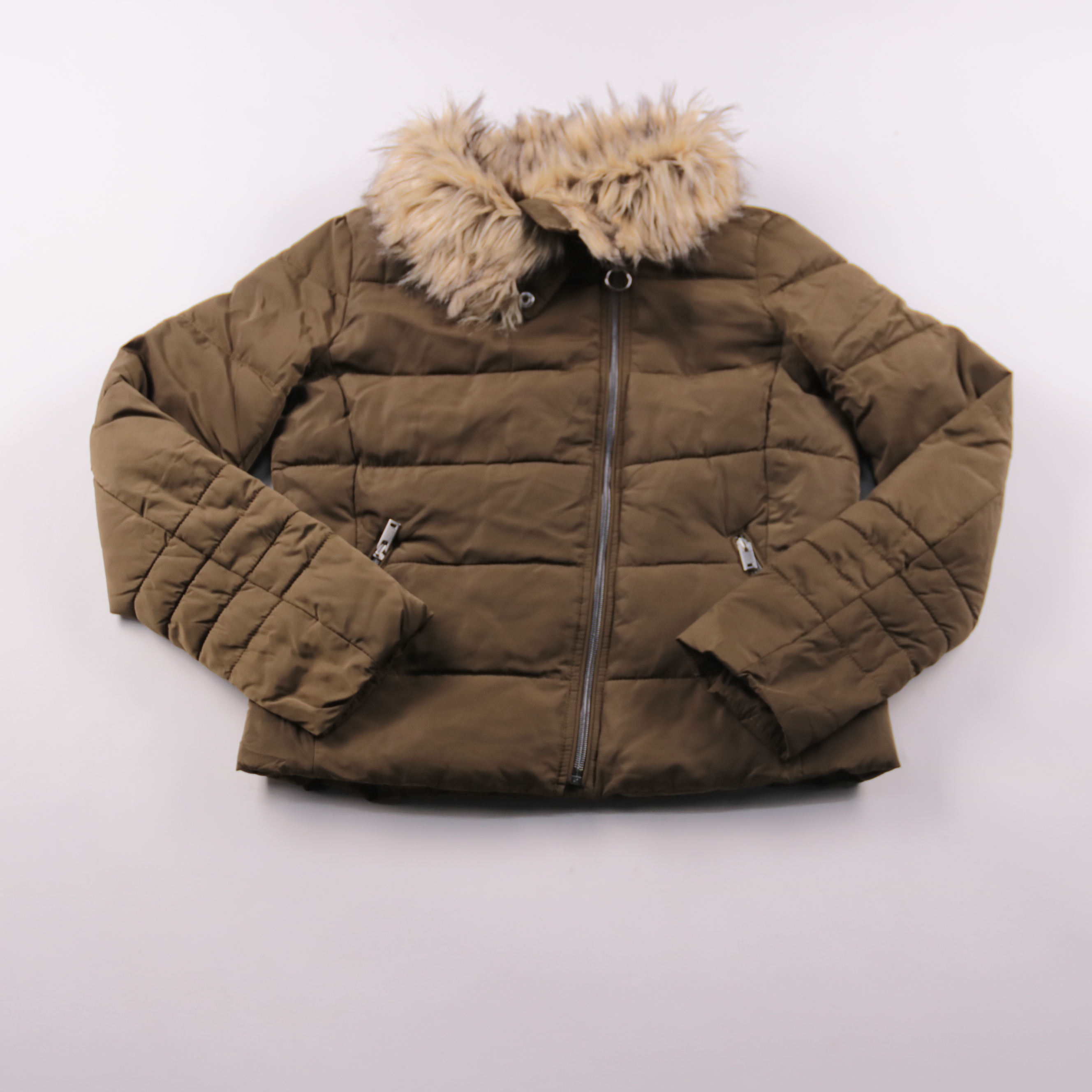 Женская стёганая куртка Clockhouse оливково-коричневого цвета с капюшоном и меховой отделкой. Подойдёт для зимних прогулок и повседневной носки, хорошо сочетается с джинсами и тёплыми ботинками. Утеплённая и с карманами на молнии — удобно и практично в...