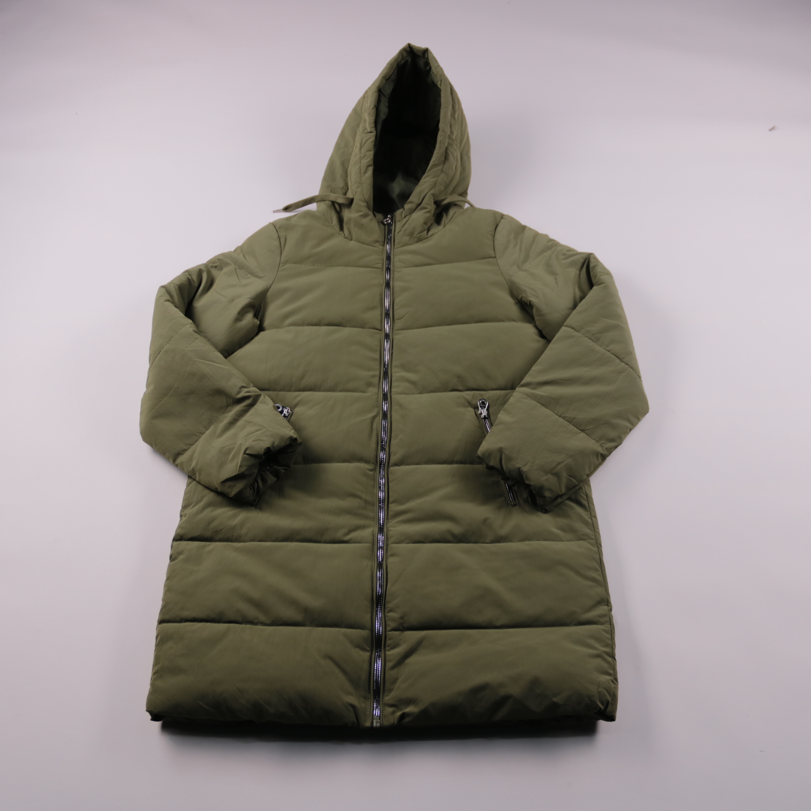 Зимняя стёганая куртка Only цвета хаки с капюшоном и застёжкой на молнию. Подойдёт для прогулок и повседневной носки в холодную погоду. Практичные карманы на молнии и объёмный утеплитель хорошо сохраняют тепло.