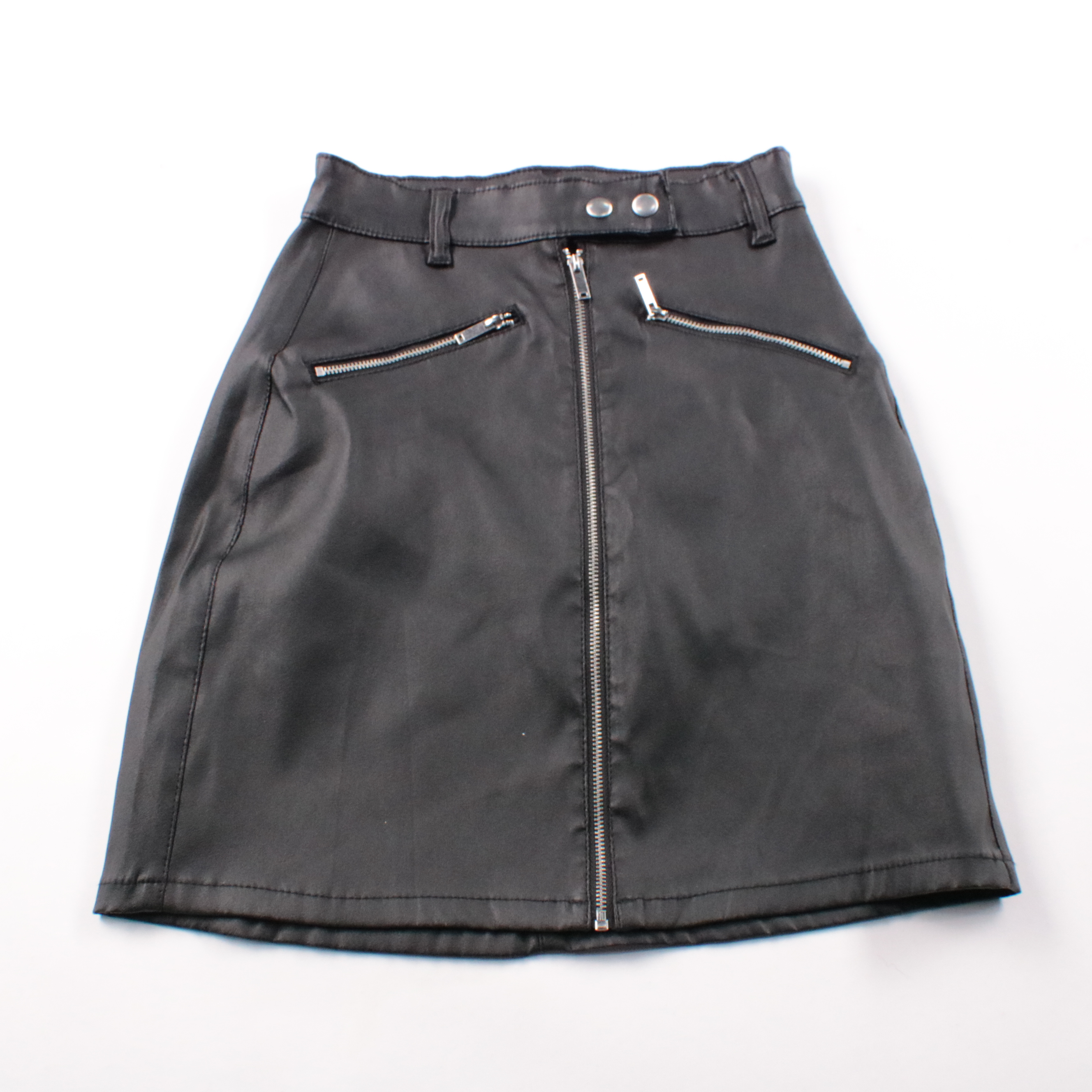 Женская юбка Primark из искусственной кожи, чёрного цвета, с центральной молнией и декоративными карманами на молниях. Подойдёт для повседневных и вечерних образов с ботинками или кедами. Материал легко протирать и он хорошо держит форму.