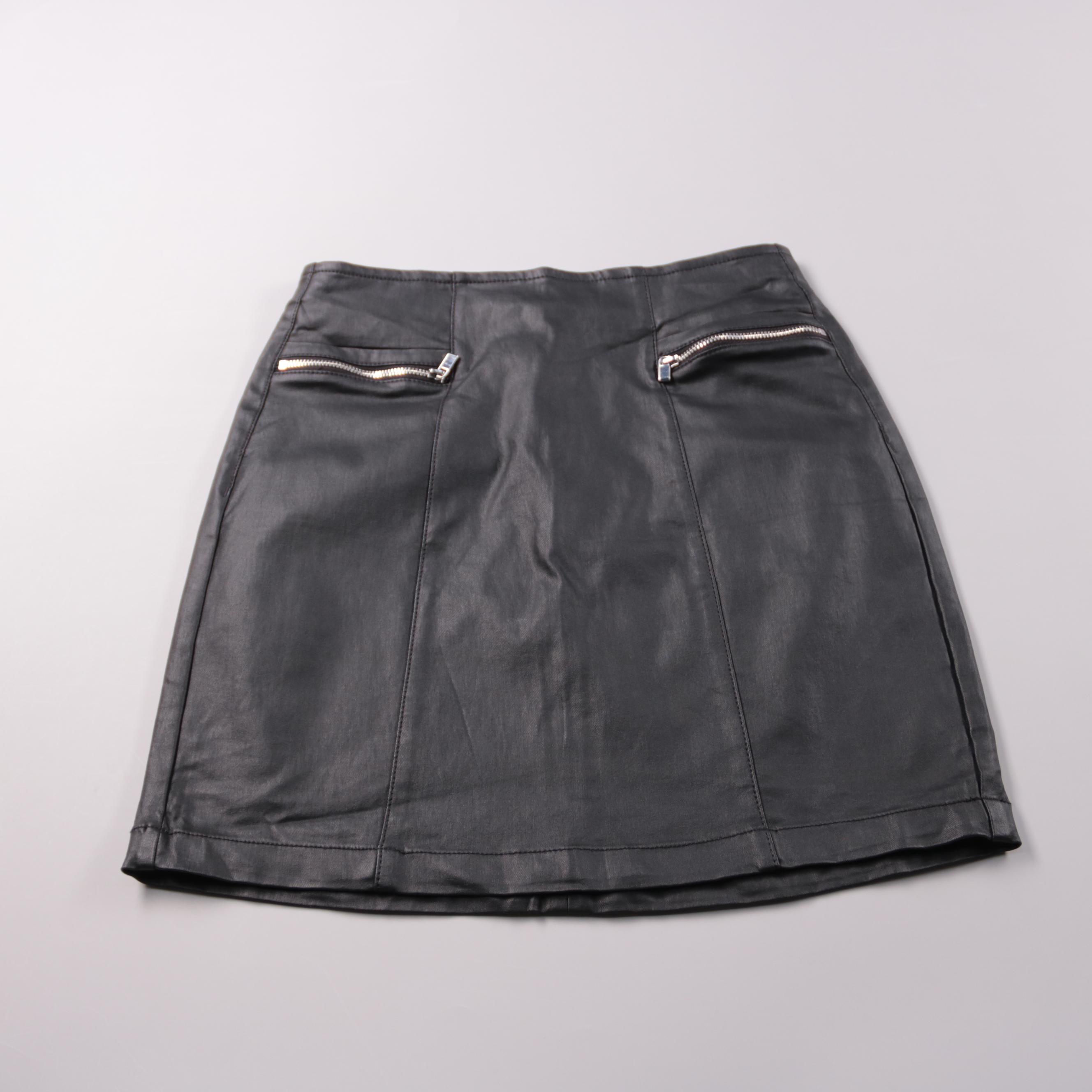 Женская юбка Next из плотного материала с легким блеском, чёрного цвета, с декоративными молниями спереди. Подойдёт для повседневных образов и на выход, хорошо сочетается с рубашками и свитерами. Практичный плюс — материал со стрейчем, поэтому юбка ком...