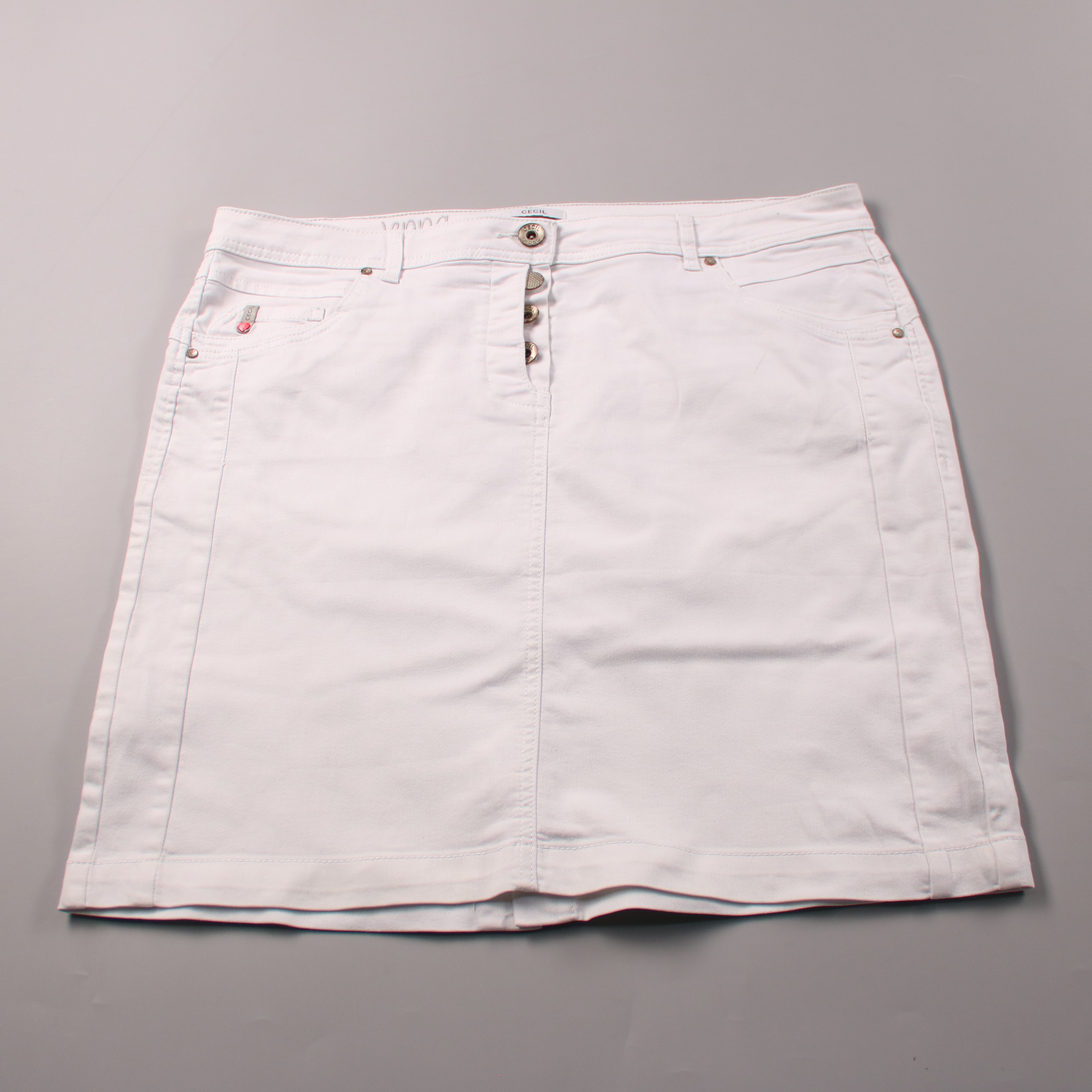 Белая юбка CECIL из хлопкового стрейч-денима с застёжкой на пуговицах спереди и карманами. Подойдёт для летних повседневных образов и отдыха, легко сочетается с футболками и рубашками. Практичный плюс — тянущаяся ткань комфортно садится по фигуре.