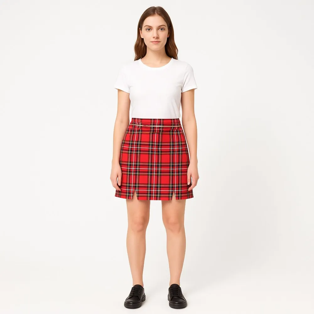 Женская юбка в красную клетку (тартан) с высокой посадкой и небольшими разрезами спереди. Подойдёт для повседневных образов и учёбы/офиса в стиле casual. Плотный хлопковый материал с добавлением эластана немного тянется и комфортно садится по фигуре.