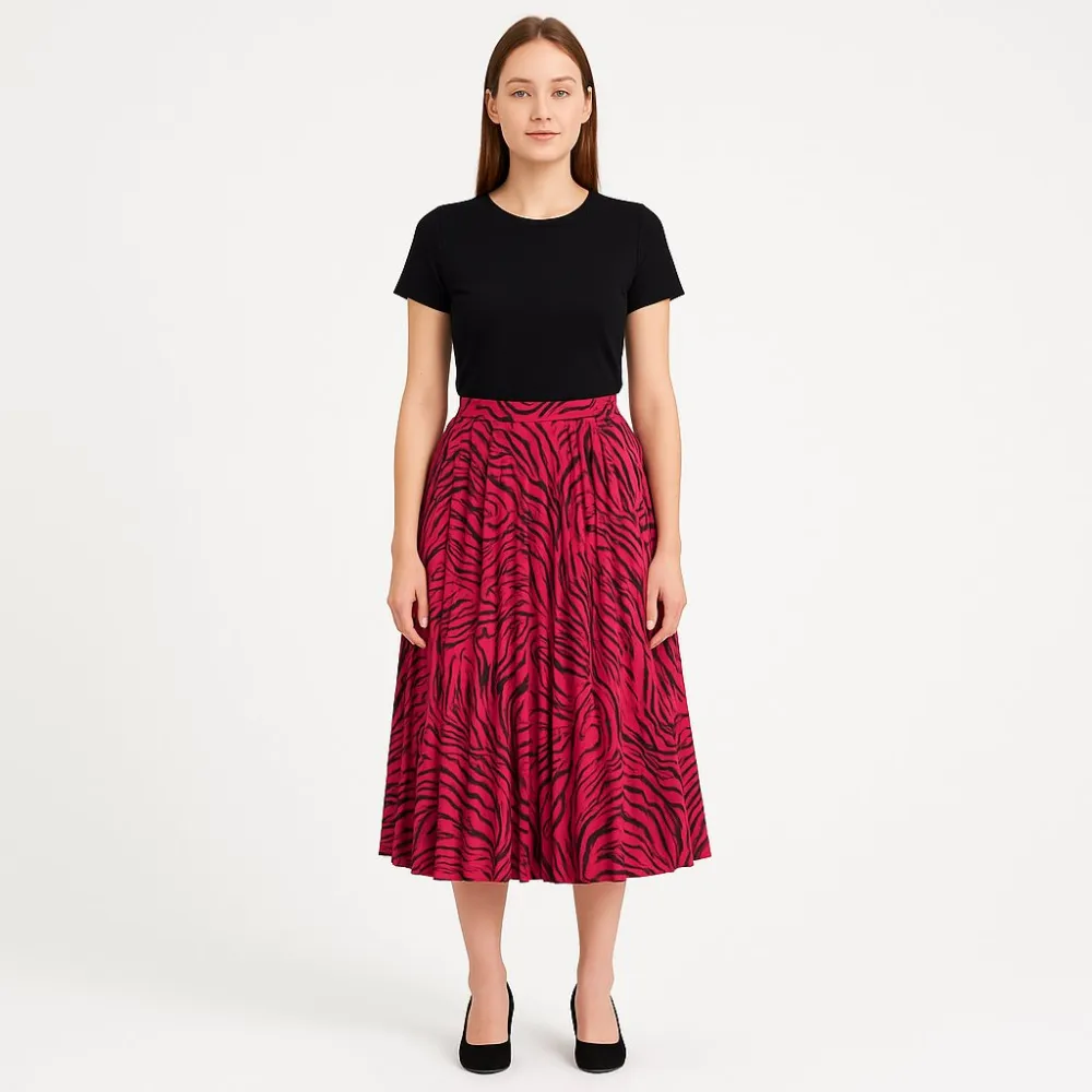 Юбка New Look миди с ярким розово-чёрным принтом под зебру и эластичным поясом. Подойдёт для повседневных образов и выхода, хорошо сочетается с однотонными топами и жакетами. Благодаря свободному крою не сковывает движения и комфортно носится весь день.