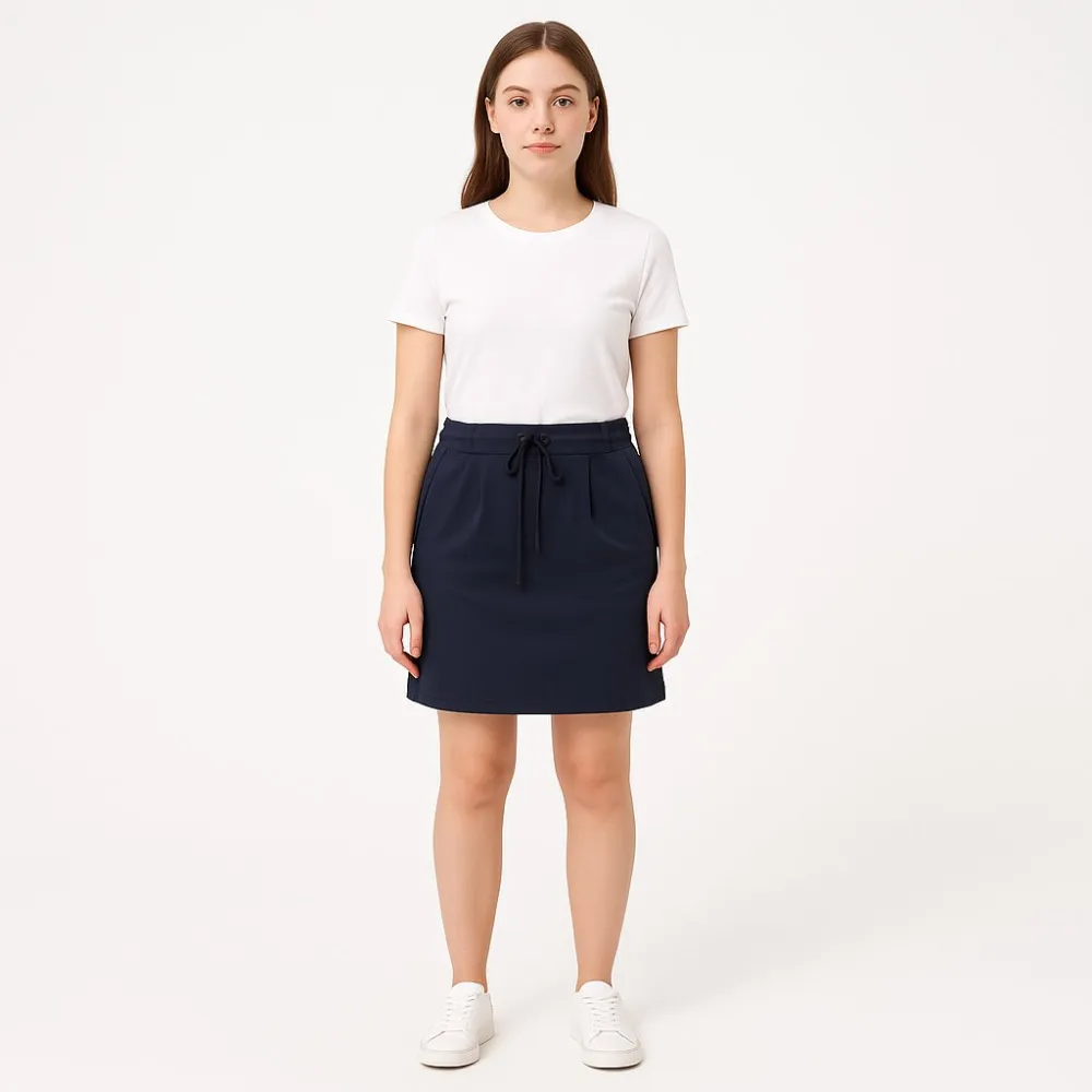 Юбка Only Blue Denim тёмно-синего цвета, длина мини, с эластичным поясом и завязками. Подойдёт для повседневных образов летом и в тёплый демисезон с кедами или кроссовками. Ткань с эластаном тянется и комфортно сидит на талии.